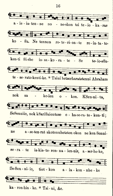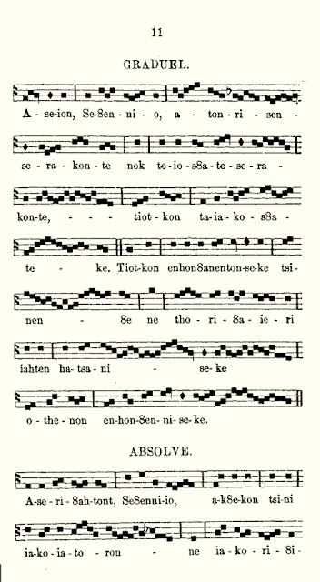 These Masses come from the Tsiatak Nihonon8entsiake, or Book of Seven Nations, published in Montreal in 1865 for the American Indian mission of Lake of Two Mountains, which contained both Mohawk-speaking and Algonquin-speaking Catholics. This mission, like others in the area, was permitted to use the vernacular for the sung propers and ordinaries of the Roman Mass.