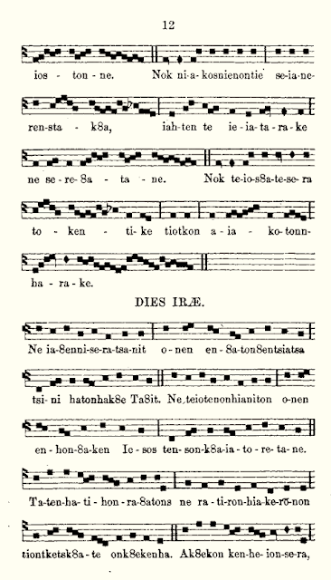 The listed ordinaries and the propers follow the Latin Requiem Mass quite closely, except rendered in the Mohawk language. I have not attempted to translate them but they seem to be fairly straightforward renderings of the Roman texts. The “8” seen in some of the words, e.g. Se8enniio = “Lord”, literally “you who are master”, is a letter devised by the Jesuit missionaries for a “w” sound.