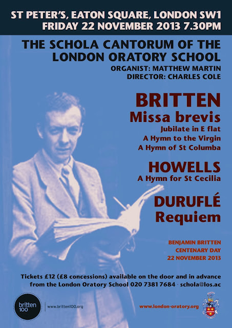 2013 marks the 100th anniversary of the birth of Benjamin Britten (1913-1976), one of the greatest English composers of the twentieth century. Across the world a vast number of concerts and events are taking place to mark the centenary. These events reach their peak next Friday, 22 November, the Feast of St Cecilia, Patron Saint of Music and Musicians, and appropriately the birthday of Benjamin Britten. One of my choirs, the Schola Cantorum of the London Oratory School, will be singing a number of works by Britten at a centenary concert at St Peter’s, Eaton Square in London that day (see below) including his famous Missa brevis written for the choristers of Westminster Cathedral. The second part of the concert will be a performance of Duruflé’s Requiem.