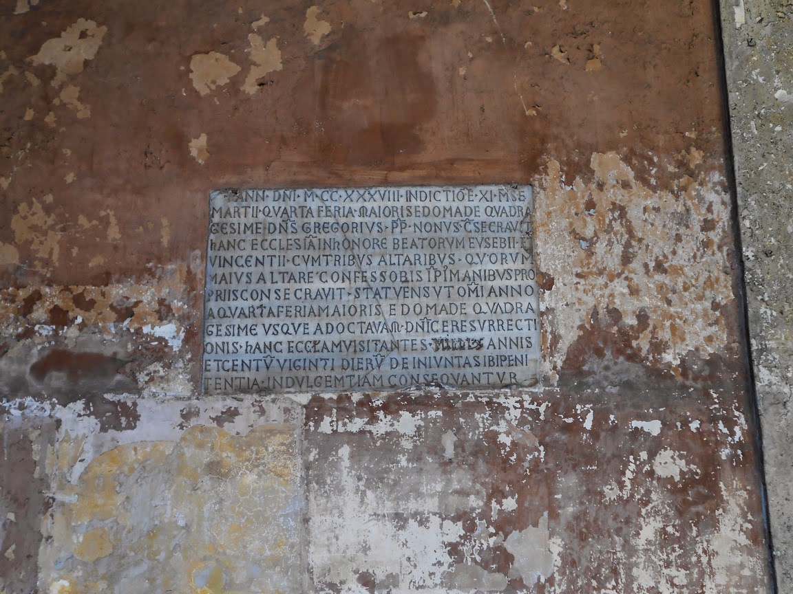 | This plaque in the portico notes that Pope Gregory IX (1227-1241) consecrated the church on the day of the Lenten Station in 1238. (March 19th) |