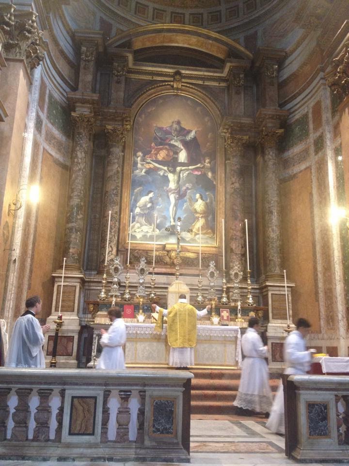 The Station for this day was originally at Saint Lawrence Outside-the-Walls, but later transferred into the city at the church with the peculiar name of “Santa Clause in Prison”. This stems for a legend that St Nicholas of Myra was brought to Rome by the Emperor Constantius II for his opposition to Arianism, and imprisoned in the basement of one of the three small Roman temples on which the church now sits.The same day (April 5th), the Feast of St. Vincent Ferrer - Sung Mass in the Dominican Rite at Santissima Trinità dei Pellegrini