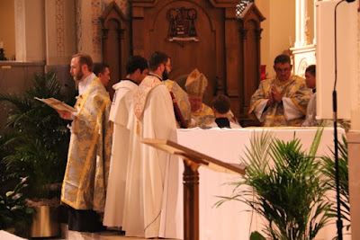 This article and the accompanying pictures were submitted by reader Barbara Wyman a few days ago, but I saved them for today, the eve of the eighth anniversary of the motu proprio Summorum Pontificum. Many years ago, in a place that shall remain nameless, friends and colleagues of mine were involved in organizing a Pontifical Mass, which was preceded by much wringing of hands over whether a full Pontifical Mass was opportune, or whether a Prelatitial Mass (i.e. the bishop’s form of Low Mass) would be less “controversial”. Happily, these controversies have (in many places, by no means all) become a thing of the past, and there is no longer any surprise or novelty to hear of an American bishop saying a Pontifical Mass from the throne in his own cathedral - another reason to thank Pope Benedict!