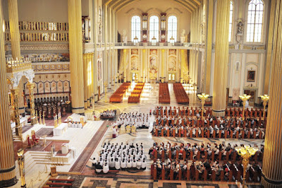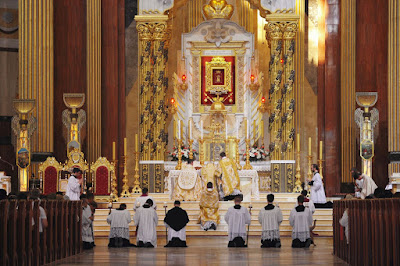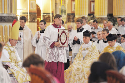 Our thanks to the organizers of the Ars Celebrandi workshops for sending us these photographs and the accompanying press release. I would call our readers’ attention particularly to the report in the second paragraph of Bishop Schneider’s words about the false opposition between the observance of liturgical norms and interior participation in the liturgy, and the “deep wound” in the heart of the Church caused by lack of reverence for the Blessed Sacrament. Most of the photographs below were taken at the Pontifical Mass, but the last one is of the blessing of new chalices, and the three before that are of Pontifical Vespers.
