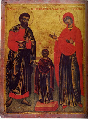 | An 18th-century icon of Ss Joachim and Anne with the Virgin Mary, from the monastery of the Pantocrator on Mt Athos. |