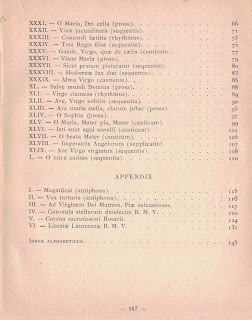 Once I began to sing the chants inside Cantus Mariales — which bears the subtitle quos e fontibus antiquis eruit aut opere novo veterum instar concinnavit — I knew that I had stumbled on a goldmine that deserved to be republished. The editor, Dom Joseph Pothier, O.S.B., is well known to chant afficionados as one of the great maestros and paleographers of the Solesmes monastic movement. Dom Pothier ranged through manuscripts finding Marian sequences, proses, and rhythms from all centuries. Some of these were already fitted with melodies, others he adapted to existing melodies, and still others he set to neo-Gregorian compositions. At the end of most pieces, the sources of text and melody are indicated. (The preface and annotations are in Latin.) Here is the Table of Contents: