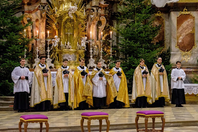 On Sunday, I published some photos of the Fraternity of St Peter’s German seminary visiting Buxheim Charterhouse, and celebrating Mass there for the feast of the Immaculate Conception. That same day, the community celebrated Vespers at another famously beautiful abbey, Ottobeuren, just ten miles down the road from Buxheim; here are some photos of the ceremony, once again, reproduced by the kind permission of the FSSP. (Click here to see the full album.) It is especially heartening to see how young the fellows are whose priestly formation is grounded in the fullness of the Church’s liturgical tradition.