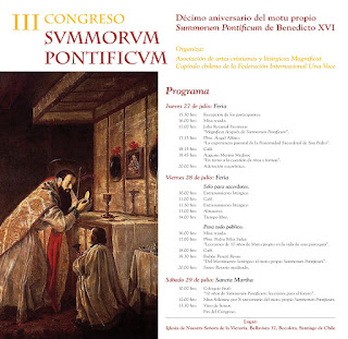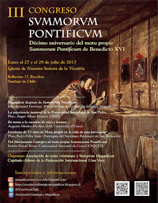 Magnificat-Una Voce Chile will hold its third annual Summorum Pontificum Conference in Santiago, Chile, to commemorate 10 years of the motu proprio, July 27-29, at the church of Nuestra Señora de la Victoria, located at Bellevista 37, Recoleta. For the full schedule, see their website, and the posters below. (Click to enlarge.) The liturgical celebrations are all open to the public.