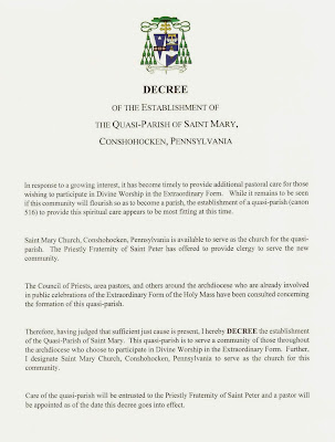 His Excellency Charles Chaput, the Archbishop of Philadelphia, has assigned a church in his archdiocese to the Fraternity of St Peter. The church of St Mary in the suburb of Conshohocken was built in 1950 for the local Polish community, and merged with another local parish in 2014. According to an official decree dated March 14th and signed by the Archbishop, a quasi-parish (canon 516) for the Extraordinary Form will be officially established as of August 1st of this year.